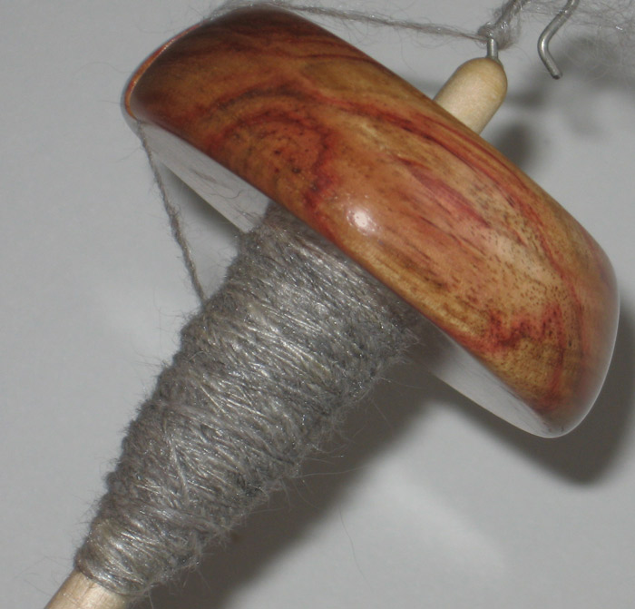Beyond its behaviour, it's an absolute pleasure to use. The wood feels like satin. The turnings on the end of the spindle shaft are a delight to my fingers each time I wind on more yarn. Whenever I set the spindle down, I can't help but admire its sleek lines -- so simple, but so lovely. It's just... perfect!