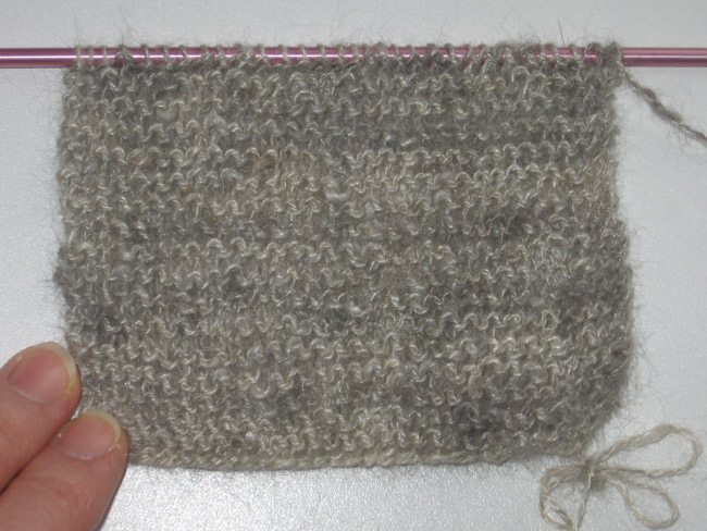 But here you can see the thing that makes this swatch so wonderful: the deep tog fibres shine through with a nice sheen, while the thel, appearing here and there in patches, spreads its warmth through the knit stitches like a friendly cloud.