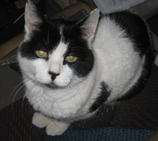 It was a good plan! During those first few days, while they were both grappling with the concept (but hadn't yet been less than two meters apart), we took Big Guy to the vet for a check-up (it's best to be safe). Well. The first thing the vet said, after feeling the cat's torso and giving it a listen, was, "I think he has a major heart problem." The second thing he said was, "He's severely anemic -- the skin in his eye sockets is white instead of pink! That could account for what sounded cardiac." Then he drew a blood sample and took it into the lab area. In ten minutes or so he came back and said, "Well, I'm sorry to say that this cat has AIDS."