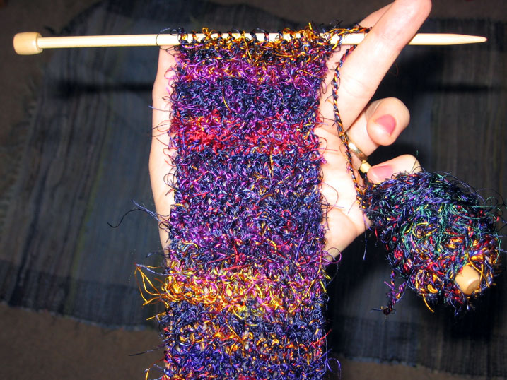 I must say, though, that when knitted this yarn doesn't show itself off quite as well as it could (left). To be really "showcased", I think it would work better as a high-texture stripe in a woven fabric, maybe even a series of narrow stripes at the cuffs of a jacket, or as vertical accents on a tailored vest.