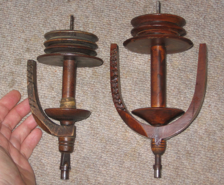 Looking at this treadle, though (left), there's no evidence of a previous spinner's foot. One of the leather hinges has been replaced, the other is a bit stiff; but they're not worn. And the flyer (right) also is remarkably intact; there's some rust on the wires, but no strong visible history of use. The second flyer (with the broken arm) also shows no sign of heavy use; its break follows the wood grain and was probably caused by a bump or fall.